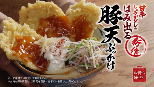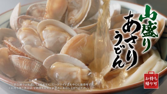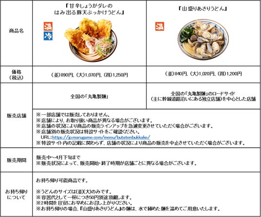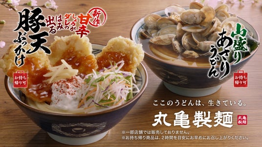 今年3月4日の販売開始以降、SNSで「もちもちのうどんに豚天としょうがダレがマッチして大満足!」「豚天が大きくて食べ応え抜群!」「レギュラー化しませんか?」などのご好評のお声をいただいている春の新作『甘辛しょうがダレのはみ出る豚天ぶっかけうどん』と、「今年も丸亀製麺のあさりうどんの季節が!」「これこれこの味!毎年食べています」などの復活を喜ぶお声をいただいている春の定番『山盛りあさりうどん』。この機会にぜひご堪能ください。