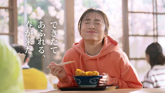 新TVCMには、打ち立てうどんに揚げたてで丼からはみ出るほどの大きな豚天を3枚、そこに特製の甘辛しょうがダレとコクのあるタルタルソースをあわせた春の新作『甘辛しょうがダレのはみ出る豚天ぶっかけうどん』と、丼にたっぷりの殻付きあさりを盛り付けた、あさりの旨みがあふれる春の定番『山盛りあさりうどん』が登場します。見た瞬間から食べ終わるまでわくわくが止まらない心弾む2商品を頬張り、そのおいしさに思わず笑顔があふれる上戸さんにご注目ください。