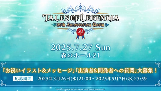 株式会社バンダイナムコエンターテインメントは、『テイルズ オブ』シリーズのファンイベント「TALES OF LEGENDIA ~20th Anniversary party~」を2025年7月27日(日)に、松戸 森のホール21 (千葉県松戸市千駄堀646番地の4)にて開催いたします。