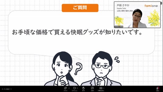 「子どもを願うすべての人によりそい 幸せな人生を歩める社会をつくる」をビジョンに掲げ、法人の従業員向け福利厚生や自治体の住民向け支援を行うヘルスケアサポートサービス「ファミワン」 https://famione.com/benefit/などを展開する株式会社ファミワン(本社:東京都渋谷区、代表取締役:石川勇介)は、コクヨアンドパートナーズ株式会社(本社:東京都千代田区、代表取締役 榎本 淳一)の従業員に向けて、オンラインセミナー「あなたの睡眠大丈夫? 眠活のススメ」を開催いたしました。