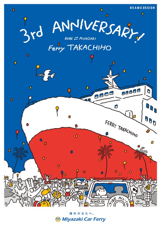 宮崎カーフェリー株式会社(本社:宮崎県宮崎市、代表取締役社長:郡司行敏)は、株式会社ビームス(本社:東京都渋谷区、代表取締役社長:設楽洋)のライセンスブランド〈BEAMS DESIGN〉による「フェリーたかちほ」、「フェリーろっこう」就航3周年キャンペーンを展開します。