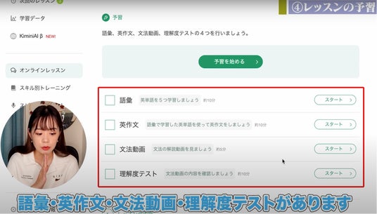 ・レッスン前の予習では、事前に学習する語彙や文法などをバランスよく学習ができる