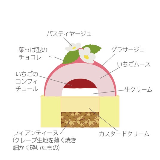 果肉を大きく残した「いちごのコンフィチュール」を「いちごのムース」で包み込みました。春らしい色合いの、チョコレートの葉っぱとお花のパスティヤージュ(砂糖菓子)をトッピングした見た目も華やかなスイーツです。