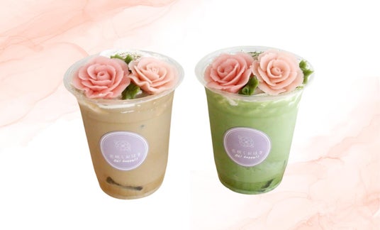「花咲くわらび餅ドリンク」(税込800円)は、抹茶ラテやほうじ茶ラテにわらび餅を加え、ホイップクリームと餡フラワーで華やかに仕上げた贅沢な一杯。