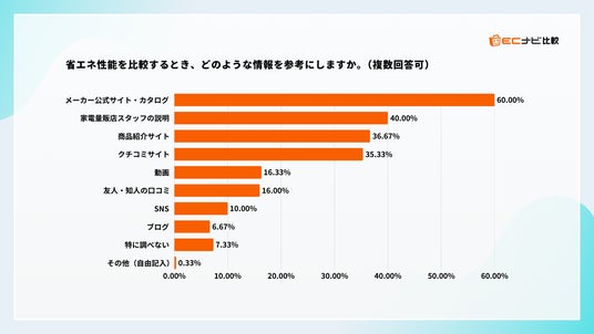 家電の省エネ性能を比較するとき、どのような情報を参考にしているか聞いたところ、「メーカー公式サイト・カタログ」が60.00%と最も多く、次いで「家電量販店スタッフの説明」(40.00%)、「商品紹介サイト」(36.67%)、「クチコミサイト」(35.33%)が続いています。公式情報と専門家の意見が重視される傾向があり、SNS(10.00%)やブログ(6.67%)などのソーシャルメディアからの情報は相対的に参照されていないことがわかります。