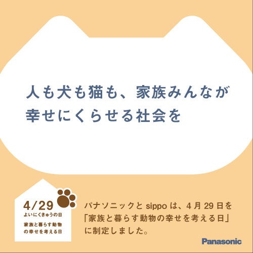 パナソニックはこれからも製品や事業、動物保護活動への支援を通して、いま犬猫と暮らしている方もそうでない方も、人も犬も猫も、家族みんなが幸せに暮らせる社会になるように、取り組んでいきます。