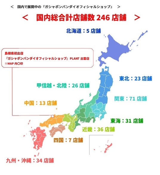 『ガシャポンバンダイオフィシャルショップ』は、2021年9月に1号店をオープン以来、全国に出店を拡大。このたび47都道府県最後の出店地として、満を持して島根県に初出店することで、約3年6か月で、カプセルトイ専門店業界初※1の全国47都道府県への出店を達成します。