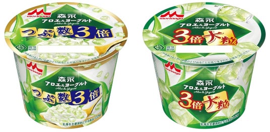 つぶ数が3倍で楽しい気持ちになれる新発売の「森永アロエ&ヨーグルト つぶ数3倍」と、アロエの粒を3倍大きくした食べごたえのある「森永アロエ&ヨーグルト 3倍大粒」。2つの「3倍」を、ぜひお召しあがりください!