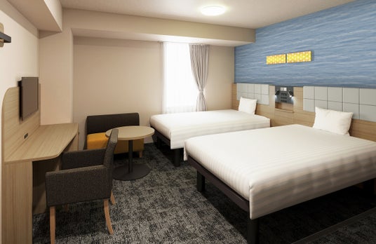 ツインエコノミーでは、家族はもちろん、友人と一緒に快適にお過ごしいただけるよう、座り心地の良いベンチソファーや丸テーブルを設置します。また、ヘッドボードを改良し、2台のベッドをつなげてハリウッドツインにも変更可能となります。