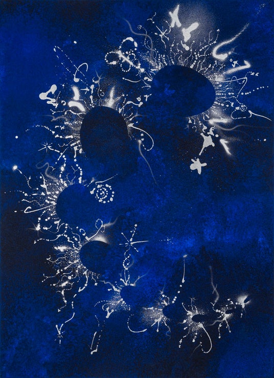 鈴木ヒラクは、ドローイングの概念を拡張し、空間や時間に潜在する線を探求しています。世界各地の古代の洞窟壁画から、植物や鉱物、光の軌跡といった非人間の描く線の断片までをアーカイヴし、身体を通して再構築することで、「ドローイングの生態学」ともいえる独自の体系を生み出してきました。本展の中心となるのは、深海や宇宙を想起させる瞑想的な青の背景に、シルバーで描かれた連作《海と記号》(2025年)です。会場では16点組の大型キャンバスが円環状に配置され、水中を漂う発光プランクトン、あるいは細胞分裂や超新星などを想起させる記号群が脈動します。光を反射するインクは、液体や粒子の飛沫となって広がり、ミクロな海洋世界とコズミックな視点が入れ替わりながら、生成と消滅の連続性を映像的に物語ります。また、考古学的遺物の写真をシルバーで塗り消し、架空の記憶を描き出す《Casting (Ocean)》(2025年)や、新作映像インスタレーションもあわせて展示します。