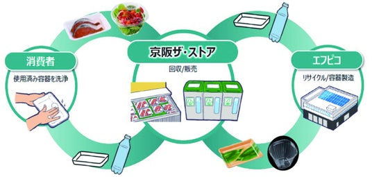 エフピコと京阪ザ・ストアは、『そのお店が地域のエコリーダー』となることを目指し、地域の皆様の使用済み食品トレー・ペットボトルを京阪ザ・ストア店舗にお持ちいただき、店頭に設置している回収ボックスにて回収を実施しております。回収した使用済み食品トレー・ペットボトルはエフピコの資源として活用され、これらの回収資源からエコ製品「エコトレー」「エコAPET」に生まれ変わり、再び京阪ザ・ストアの売場で使用することで循環型の水平リサイクルを実現しております。