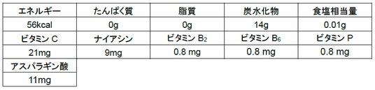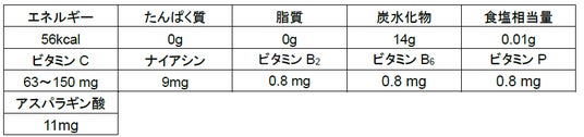 原材料名:果糖ぶどう糖液糖(国内製造)、はちみつ、ローヤルゼリーエキス、高麗人参エキス/炭酸、香料、クエン酸、ビタミンC、アスパラギン酸Na、ナイアシン、グルタミン酸Na、ビタミンB2、ビタミンB6、ビタミンP、フェニルアラニン、イソロイシン、スレオニン