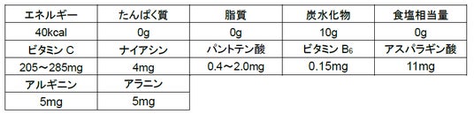 原材料名:果糖ぶどう糖液糖(国内製造)、ローヤルゼリーエキス、高麗人参エキス/炭酸、香料、ビタミンC、クエン酸、アスパラギン酸Na、ナイアシン、グルタミン酸Na、ビタミンB2、ビタミンB6、ビタミンP、フェニルアラニン、イソロイシン、スレオニン