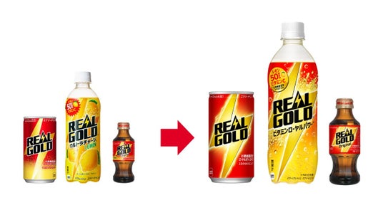全製品において「リアルゴールド」のアイコンである“サンダー”をさらに光らせ、シンプルながらも“元気感”を強めたパッケージデザインに刷新します。また、PETボトル製品「リアルゴールド ビタミンローヤルパワー」は、「リアルゴールド ウルトラチャージ」をフルリニューアルし、レモン50個分のビタミンCや杉養蜂園認定のローヤルゼリーエキスなど、従来の美味しさのポイントはそのままに、ゴクゴクと飲みやすいライトな味わいに進化します。