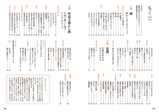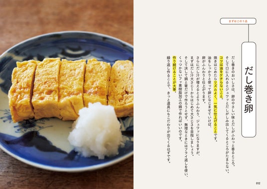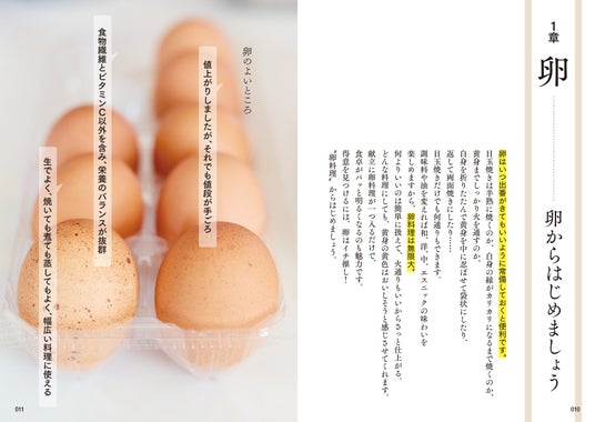朝食やお弁当、夕食にも活躍する卵は、毎日の食卓に欠かせない食材の1つです。第1章では、基本のだし巻き卵から、卵サンドやオムライスなど、和洋中のバリエーション豊かな卵レシピを紹介します。卵は扱いやすく、火の通りも早いため、手早く調理できるのが魅力的。献立に卵料理が1つ入ると黄身の色味でパッと明るくなります。手軽に挑戦できるレシピがたくさんあるので、ぜひ卵料理からはじめましょう。