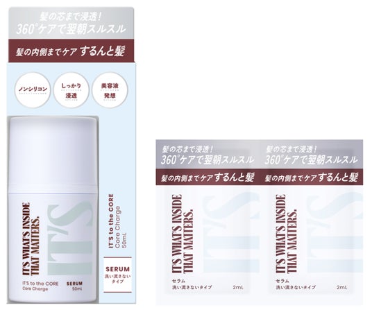 そして今回、新たに髪の芯までケアする新ライン“トゥザコア”が誕生いたします。その第一弾として登場する「イッツコアチャージセラム」は低分子ペプチド※1を配合した独自のコアチャージ処方で、じわじわ髪の芯まで浸透し内部まで補修。単なる髪の表面をコーティングするだけでなく、髪の深部までケアするため、使うたびしなやかな「するんと髪」に導きます。