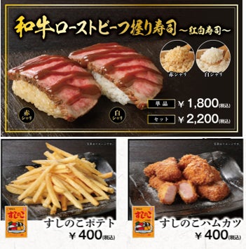 メインメニューは、“紅白寿司”をテーマに赤酢と白酢の2種類のシャリで握った和牛肉寿司。白シャリには、1893年(明治26年)のシカゴ万博で名誉金牌賞を受賞し誕生した『名誉金牌タマノイ酢』を令和版として復刻させた新商品『名誉金牌』を使用。その他、当社の代表製品『すしのこ』をシーズニングとして使用した2種のサイドメニュー、各種ビネガードリンクをご用意いたします。