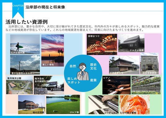 このビジョンは、本市の沿岸部が、暮らす人、働く人、訪れる人にとってさらに魅力的なエリアとなるよう、現在の地域資源を再確認するとともに、地域の未来に関心を持ち、考える指針となることでその利活用方法など新たな可能性を創出することが目的です。