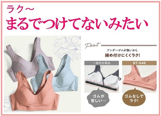 ワイヤーもアンダーゴムもないゆる~いブラジャーではありますが、着けることによりシルエットがきれいになり安心感のある商品です。お客様にはいつまでも若々しく、楽しく毎日をすごしてほしいと思います。