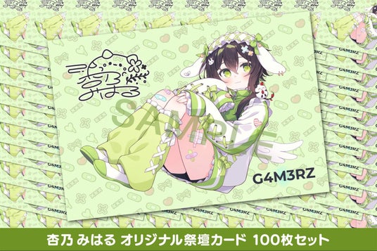 お祝い用の祭壇を手軽に作れる「杏乃みはるオリジナル祭壇カード」です。RGB印刷という手法を使いできるだけ良い発色で再現できるよう心がけて制作したカード(ポストカードサイズ)です。「推しマカロン」やグッズと一緒に撮影すれば、杏乃みはるの世界を一気に作り出すことができるこのアイテム。セットによって、最大100枚お届けするので、部屋を埋め尽くしてお楽しみください。