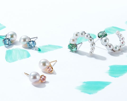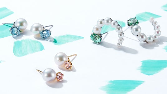 半月型のシルエットが美しいデザインには、あこや真珠のグラデーションが施され、耳元をエレガントに演出します。また、ハートシェイプ、オーバルシェイプ、ラウンドシェイプのカラーストーンがパールに寄り添うデザインも展開。上質な輝きを放つ宝石が、顔まわりを華やかに彩ります。