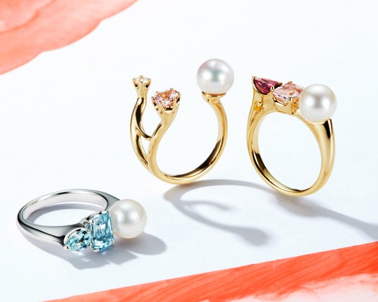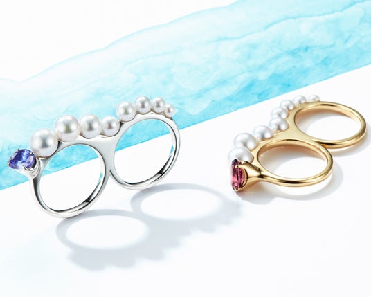 フォークリングは、シェイプの異なるカラーストーンやダイヤモンドを組み合わせることで、指先に洗練された輝きを添えるデザインに。さらに、オクタゴンカットやペアシェイプのカラーストーンとあこや真珠が並ぶストレートタイプは、相反する個性を融合させたモダンな仕上がりとなっています。