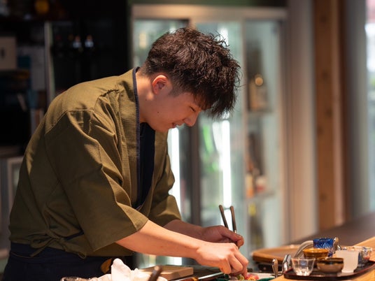 高校卒業後の2013年に海上自衛隊に入隊し、艦艇に配属され料理人(司厨士)として5年間勤務。その後2018年に退職し、レストランでの勤務を経て、2020年4月1日に初の自店「釣亭伝助」を開業。ビル地下街の一角にありながらも、銘酒の豊富なラインナップと奥能登から直送されるレベルの高い鮮魚料理を提供し、そのギャップ感も相まって口コミで話題を集めた。