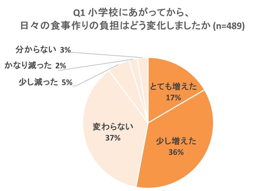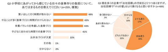 現在小学生の子供を持つ共働きの男女489名にアンケートを実施したところ、食事づくりの負担の変化を聞くと、53%が小学校にあがってから日々の食事づくりの負担が増えたと回答(Q1)。Q1で「負担が増えた」と回答した方に具体的に感じた負担を聞くと、49%が「買い出しに行く時間が取れない」、43%が「やることが多く食事づくりに時間がかけられない」「栄養バランスを考慮した食事づくり」と回答(Q2)。時間がないなかでも栄養バランスのよい食事をつくりたいという葛藤が明らかになりました。さらに、昨今進んでいる出社回帰の波で、56%が出社回帰で「小1の壁」がより高くなると思うと回答しました(Q3)。