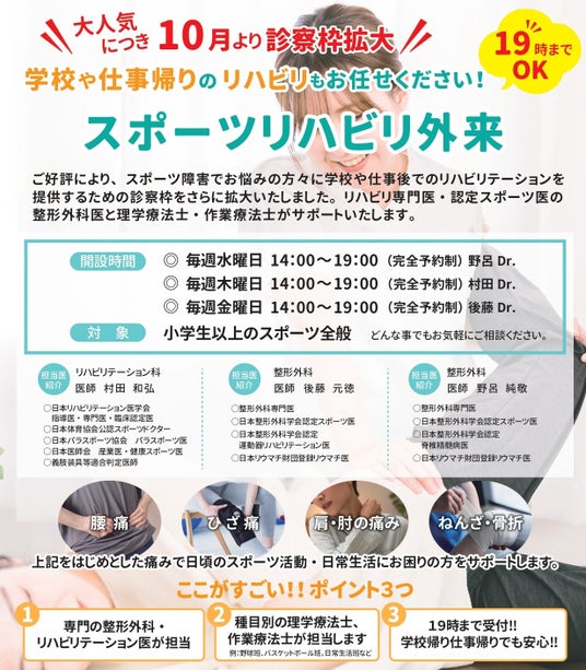 2024年8月に開設された外来スポリハでは、小中学生から高齢者まで幅広い世代を対象に、スポーツ障害や日常生活での痛みを専門的にケアしています。水曜日から金曜日は診療時間を19時まで延長し、仕事や学校帰りでも受診しやすい環境を整えています。