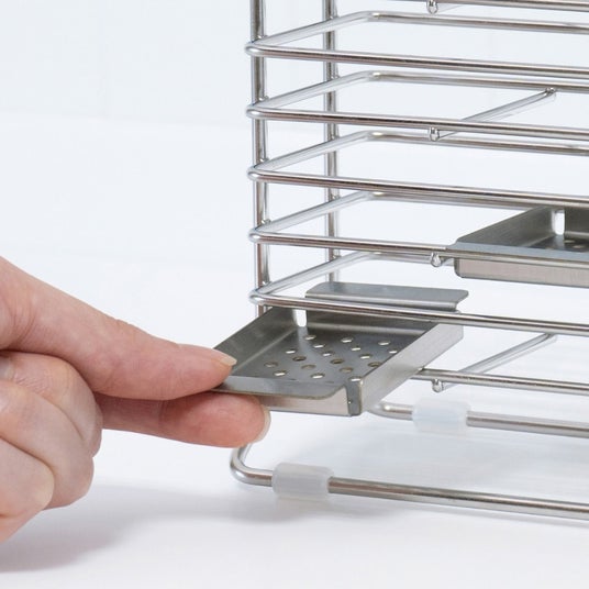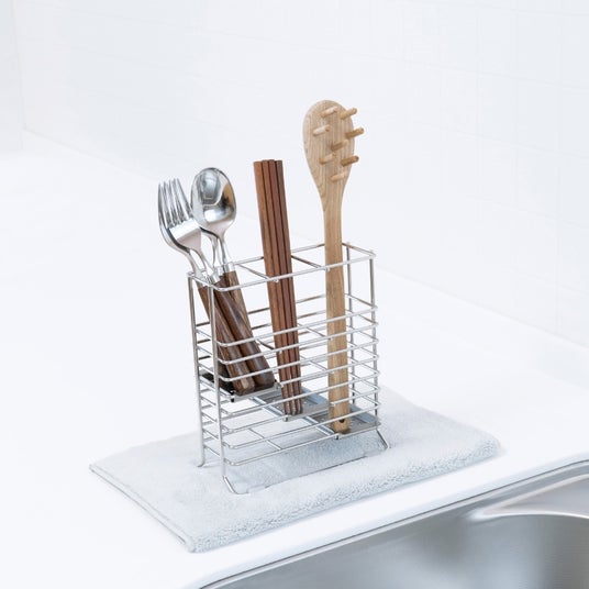 コンロ横でも場所を取らないスリム設計のカトラリー&ツールスタンドです。サビにくいステンレス製で、水切りスタンドとしても使用できます。