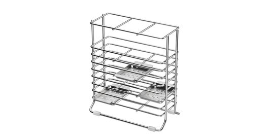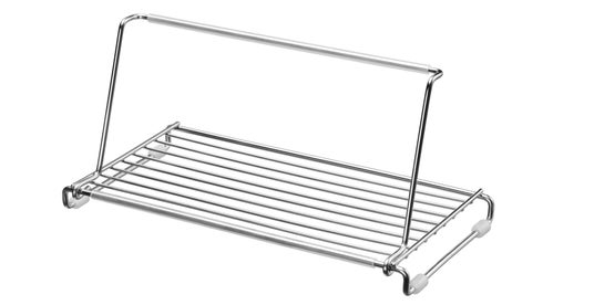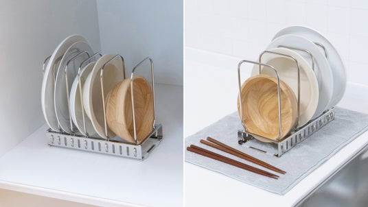 大きなお皿やお椀の大きさに合わせて調節できるディッシュスタンドです。サビにくいステンレス製で、ふきん等を敷いて水切りラックとしても使用できます。