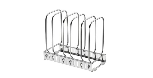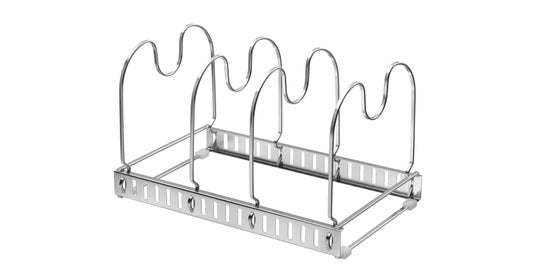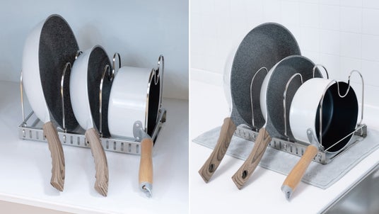 フライパンや鍋の大きさに合わせて調節できるフライパンスタンドです。サビにくいステンレス製で、ふきん等を敷いて水切りラックとしても使用できます。