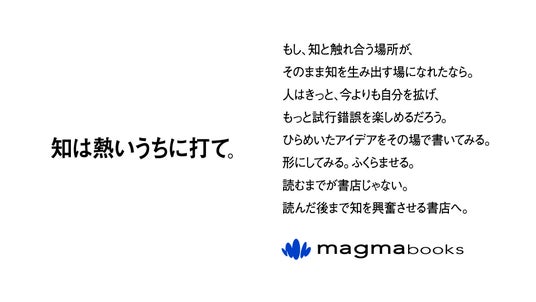 書店とは従来から、知の結晶である書籍を中心に様々な情報を得るための場所として、生活に欠かせない存在でした。そして、快適に読書の時間をすごすためにカフェなどのさまざまな機能が付加されてきた歴史があります。magmabooksは、これまでの書店をさらに進化させるべく、本を読む前(読前)から読む最中(読中)、そして読み終わった後(読後)まで味わい尽くせる、知的興奮と創造性に焦点を当て、書店の歴史に新たな1ページを加えます。