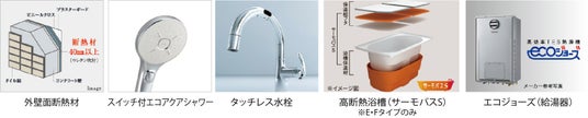 本物件は、「ZEH-M Oriented」認証しています。ZEH-M Orientedとは、建物の断熱性能を大幅に向上させるとともに高効率な設備システムを導入することにより、室内環境の質を維持しつつ大幅な省エネを実現することで、マンション全体での年間一次エネルギー消費量を20%以上削減することを目指したマンションの事です。省エネ性と断熱性を高めるために「外壁面断熱材」をはじめ、節水効果が見込める「スイッチ付エコアクアシャワー」や「タッチレス水栓」、保温組フタと浴槽保温材のダブルの保温構造でお湯が冷めにくい「高断熱浴槽」、少ないガス量で効率よくお湯を沸かす省エネ性の高い給湯器「エコジョーズ」を採用し、BELSによる建築物の省エネ性能評価書を取得しました。