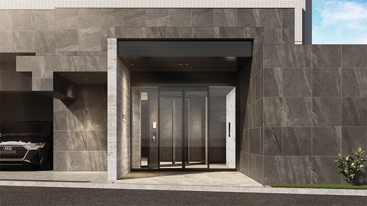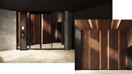 気品を漂わす紋様を描くタイルを纏い、打放しコンクリートでアクセントをプラス。シンメトリーなフォルムを持ちながらも、左右のバルコニー手摺に異なるマテリアルを用いた、品格と個性を装う外観デザイン。落ち着いたカラーリングの石目調タイルのエントランスホールを一歩中に入ると、石目調とは対照的な質感を持つ木目調のデザインウォールが悠然とした存在感を持ち、ぬくもりと優しさを湛えながら、ホワイエのような優雅さを愉しむことができます。