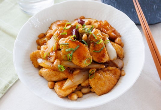 【主菜に!】ご飯がススム♪鶏むね肉と新玉ねぎと豆の照り甘酢炒め