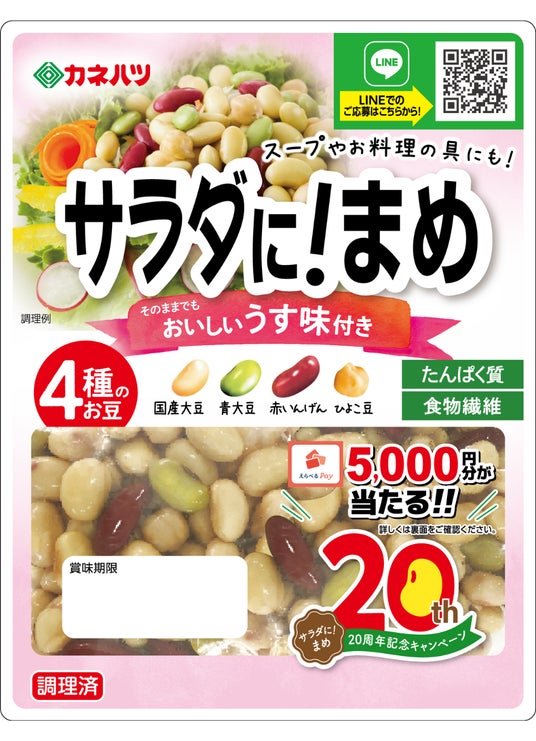 佃煮・煮豆・惣菜・おせちのカネハツブランドを展開するカネハツ食品株式会社(本社:愛知県名古屋市、代表取締役社長:加藤英敏)は、2025年4月に「サラダに!まめ」が発売20周年を迎えたことを記念し、「サラダに!まめ20周年記念キャンペーン」を4月1日(火)から5月31日(土)まで実施いたします。