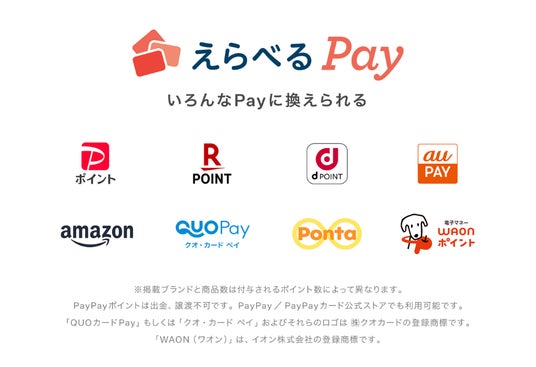 ※「えらべるPay(R)」は、株式会社ギフティが提供するデジタルギフトであり様々なスマホ決済サービスポイントの中から贈呈された「ギフトポイント」内でお好きな商品と交換することができます。「えらべるPay(R)」および「ギフトポイント」の利用には会員登録やアプリダウンロードの必要もなく、保有ポイント内で複数の決済サービスポイントを選ぶことも可能です。