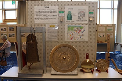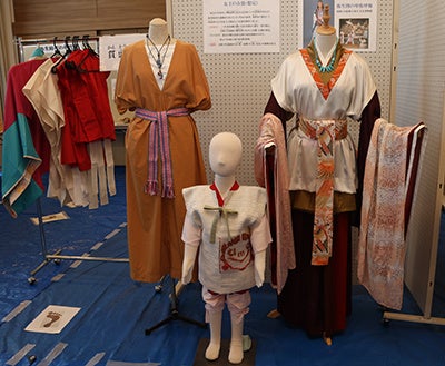 再現衣装を着ての写真撮影コーナー、土器・石包丁の再現展示など