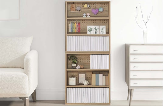 本製品は、ピュアホワイト、シャビーオーク、ウォールナット、アッシュグレーの4色で展開しております。どのカラーもインテリアに馴染むバリエーションになっています。また前述の通り、本製品は4段と6段の2サイズで展開しております。どちらも大容量の収納を誇り、収納としてはもちろん、推し活アイテムディスプレイとしてもピッタリのアイテムです。以下、カラーとサイズのイメージです。