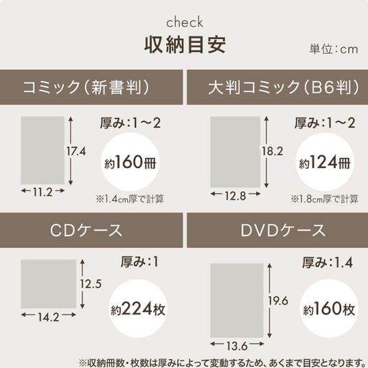 本製品奥行き17cmとスリムな仕様ながらも大容量収納を実現しており、コミックを収納する場合は160冊を収納することができます。棚板の耐荷重はそれぞれ10kgとなっている為安心して大量の推し活グッズを収納可能です。勿論、コミックだけでなく、CD、DVD(ケース含む)も収納することができます。また、より安心してご使用いただけるように、壁と固定できる転倒防止金具と本棚のぐらつきや揺れを抑える背板ストッパーの2つで補強して使用できるようになっています。
