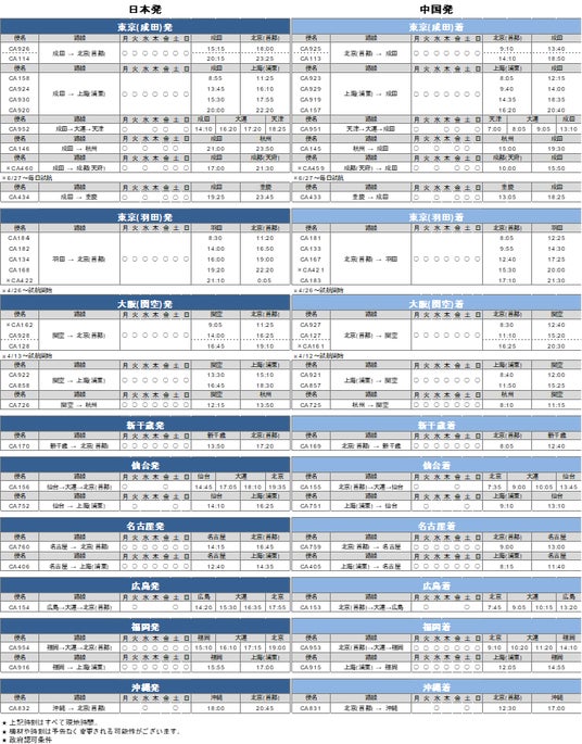 夏期スケジュールは、「成田-重慶線」(433/4便)と「成田-成都線」(CA459/60便)の成田間の増便、および「羽田-北京線」(CA421/2便)や「関西-北京線」(161/2便)の復便を予定しております。