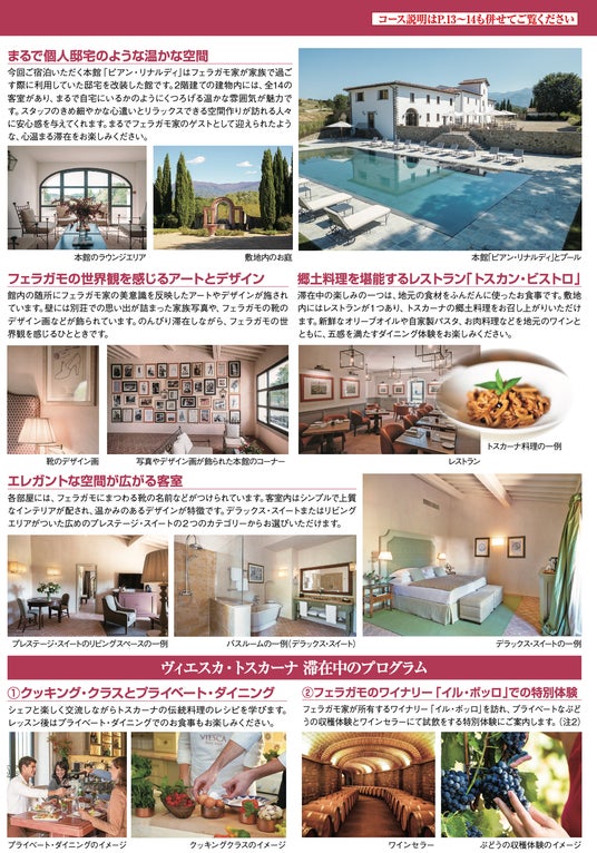 ・予約困難な小規模の星付きレストランでのディナー(フランス、イタリア) ・プライベートシェフによる特別クッキングクラスとランチ(イタリア) ・ワイナリーでの試飲やぶどうの収穫体験(イタリア、ポルトガル)