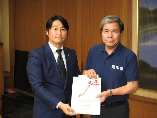 2016年8月10日 熊本県庁で蒲島熊本県知事に寄付金を手渡しする橋本町長