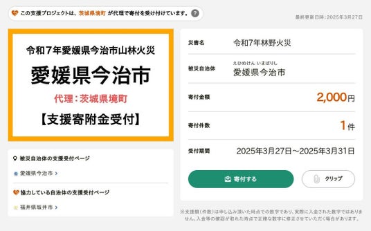 茨城県境町(町長:橋本正裕)は令和7年3月23日に発生した、愛媛県今治市の山林火災について、ふるさと納税代理寄付受付による災害支援を実施します