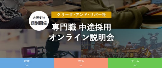 株式会社クリーク・アンド・リバー社(C&R社)は4月、映像やゲーム、Webなど、関西エリアのクリエイティブ業界における転職や未経験からクリエイターへのキャリアチェンジをご希望の方を対象に、「C&R社大阪支社 専門職中途採用オンライン説明会」を開催します。なお、本説明会は、お申し込みいただいた方のご都合にあわせて個別に実施します。