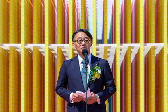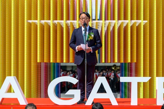 列席者のご紹介が終わると、喜㔟社長が「構想から20年、JR東日本グループの未来への夢と情熱を傾けたこのプロジェクトが、こうして最初の大きな一歩を記すことができましたのも、本日ご列席の皆様をはじめ、計画当初から様々にご指導を賜って参りました関係の皆様のご支援、ご理解の賜物でございます。高輪の地は、維新開花期には日本で最初の鉄道が走った街であります。街づくりの構想にあたり、鉄道が近代日本のイノベーションの象徴であったように、この地の持つ経譜、交流とイノベーションという系譜をしっかりと受け継ぎ、街のコンセプトである『100年先の心豊かなくらしのための実験場』をつくることを考えてきました。この街で活躍する様々なロボットやドローンが、あるいはこれから進化を続けるsuicaが、この街を訪れる皆様、またこの街に居住される皆様の生活あるいは活動をサポートいたします。今後は、複合文化施設である『MoN Takanawa: The Museum of Narratives』等のナイトタイムエコノミーへのチャレンジをはじめ、2026年春には田町寄りの3棟の建物が竣工し、同年度にはI期開発がグランドオープンを迎えます。さらに、品川駅に向けてウィングを伸ばし、歩行者デッキによって繋がる一体とした街を作ってまいります。JR東日本グループは、今日、皆様とともに、日本とそして世界の未来への扉を開かせていただきました。」とまちびらきに対する喜びと今後の構想を踏まえて挨拶。