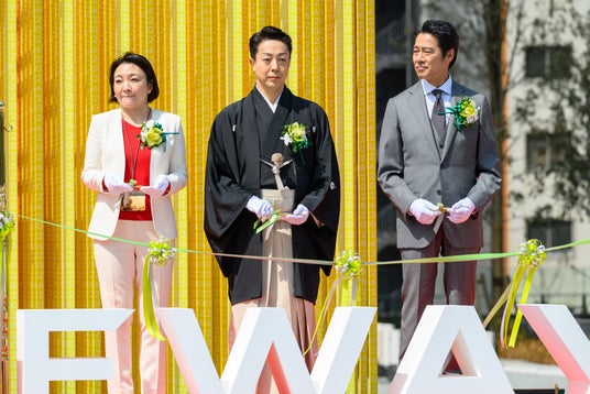 港区長や地元関係者代表者様、TAKANAWA GATEWAY CITY CM出演 堤真一様、當真あみ様ら総勢14名のテープカットセレモニーを開催!この街を象徴する自動走行モビリティやドローンを活用したセレモニーに参列者の注目が集まる!
