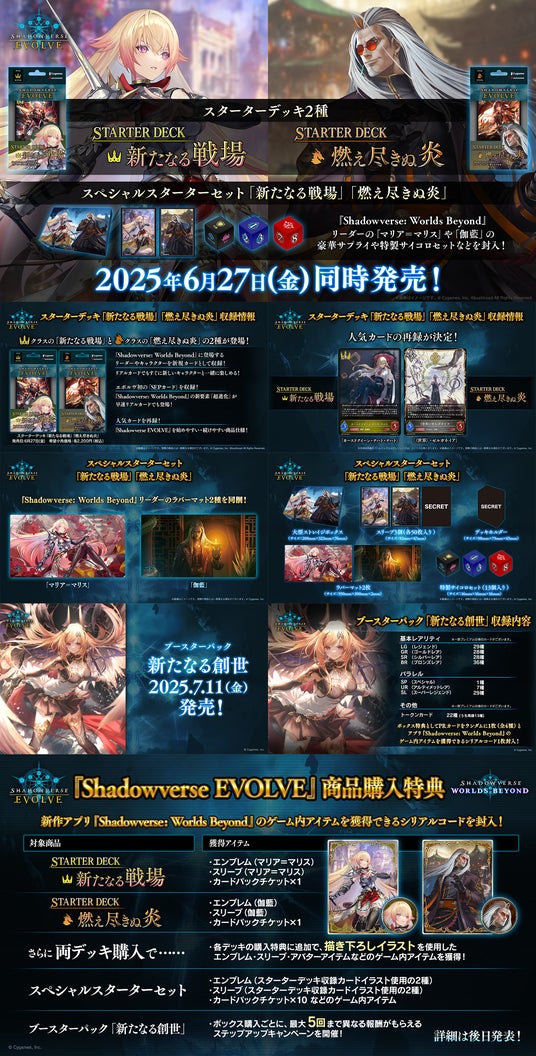 『Shadowverse EVOLVE』をすぐに始められるスターターデッキ「新たなる戦場」「燃え尽きぬ炎」が6月27日(金)に発売となります。新要素「超進化」に使用する「SEPカード」が初収録されるほか、人気カードを再録!