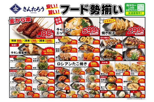 新ブランド「大衆酒場きんたろう」「大衆酒場きんたろう」は、首都圏と北海道で14店舗展開している若者を中心に人気のコスパ系居酒屋・均タロー(キンタロー)から生まれた新たなブランドです。本厚木店ではオリジナル唐揚げ「金から串」88円(税込97円)、生ビール299円(税込329円)と若者世代に大人気のコスパ系コンセプトはそのままに、大人世代にもご来店いただきやすい大衆酒場として新たに誕生しました。